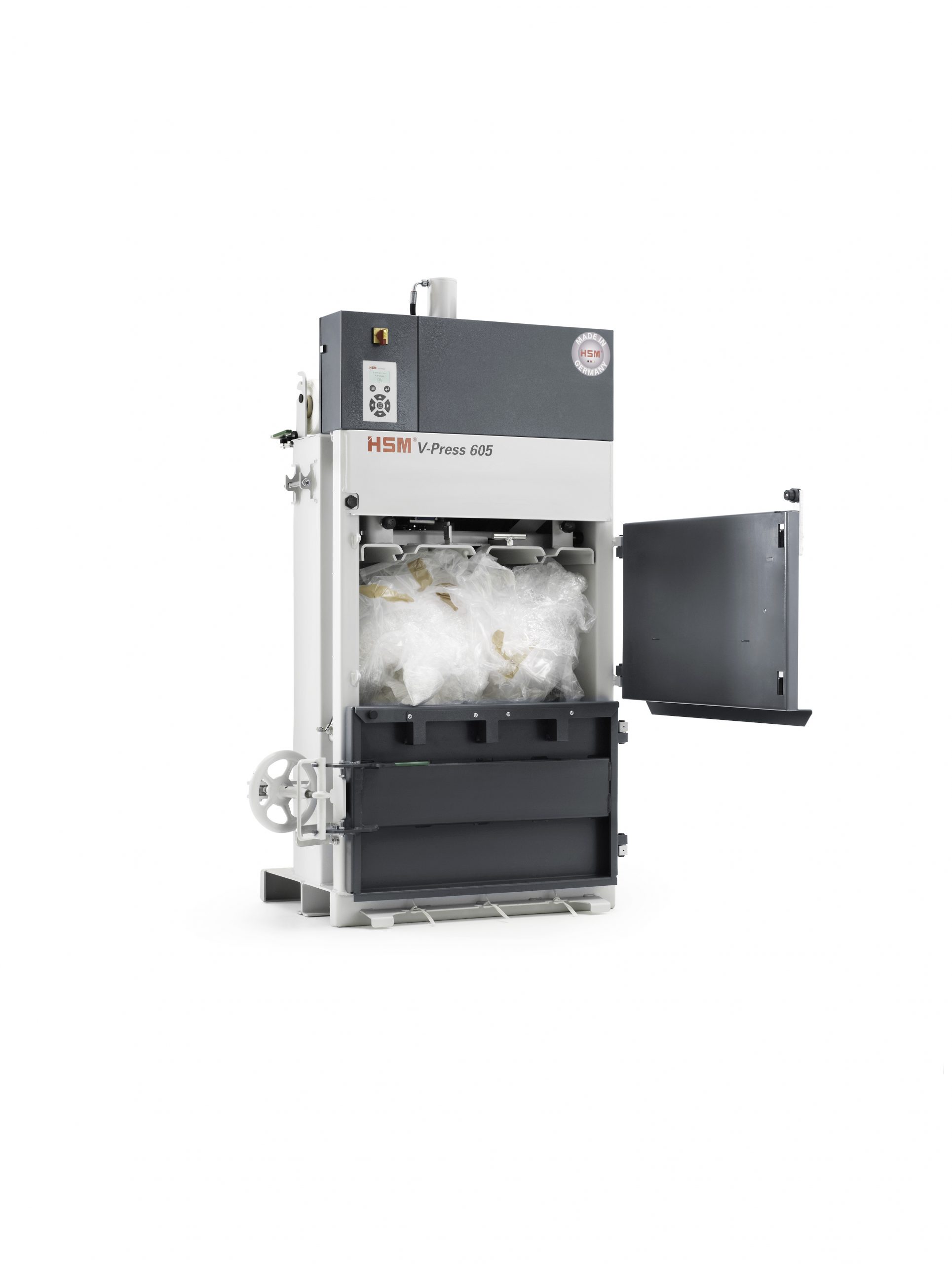 Stiskalnica za odpadni material V-Press 605 Eco znamke HSM zmanjša količino vašega uporabljenega pakirnega materiala, kot je folija in karton, in tako  omogoči, da se jih znebite ekonomično.  Zmanjšanje volumna odpada naredi transport in rokovanje z njim lažje in prihrani dragocen prostor za shranjevanje. Stiskalnica za odpadni material ima majhno višino pri nastavljanju in se tako lahko hitro in zlahka pripravi na način prihranka prostora.  Klešče za držanje izboljšajo zgoščenost stisnjenega materiala in tako izboljšajo dejavnost baliranja. Ima dvojna vrata z ventilsko ključavnico, kar olajša uporabo. Dimenzije stiskalnice za odpadni material HSM V-Press 605 eco so 1198 x 823 x 1986 mm, posledično potrebuje majhno višino za nastavitev in majhno površino za delovanje. Moč stiskanja je 57 kN, kar lahko naredi bale, težke do 70kg. Odstranitev bal je lahko z mehaničnim odstranjevalcem bal, saj odpadno balo samo prevalite na paleto ali paletni voz. Sestavitev je hitra in lahka, ni potrebe po naprednih nastavitvah, preprosto jo položite na želeno lokacijo, zagotovite elektriko, in ste že pripravljeni za delo.